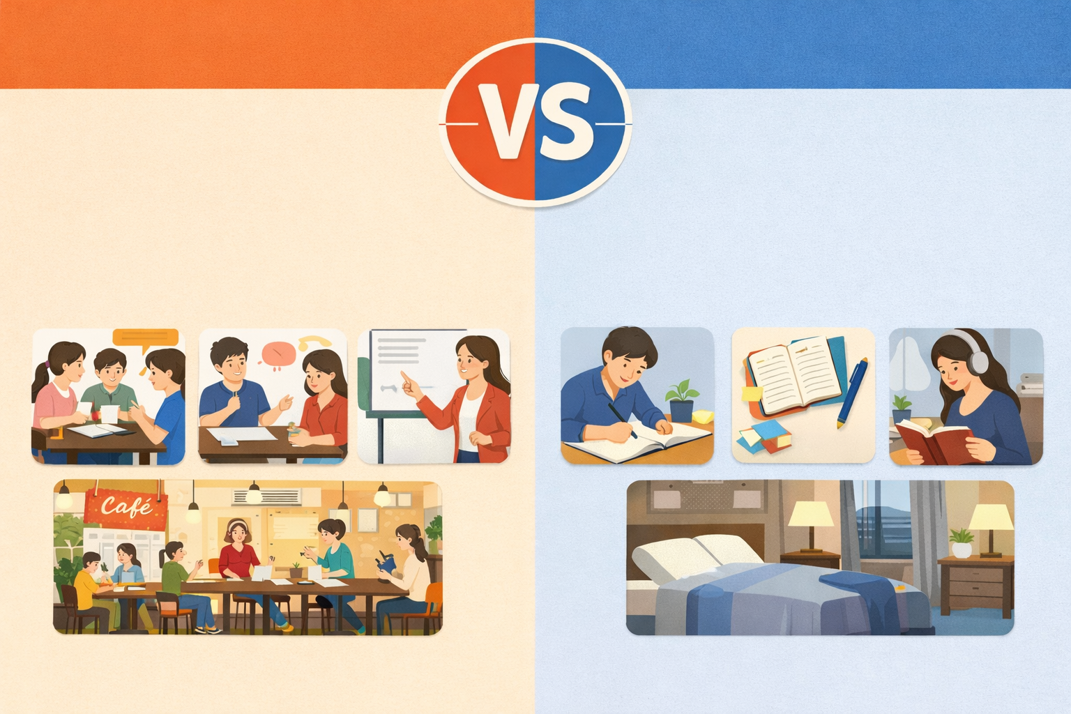 가장 기본적인 성격 구분은 외향형(E)과 내향형(I)이다. 외향형 학습자는 사람과의 상호작용에서 에너지를 얻기 때문에 혼자 조용히 공부하는 것보다 스터디 그룹, 토론식 학습, 말로 설명하는 방식이 효과적이다. 친구와 함께 문제를 풀거나, 배운 내용을 누군가에게 설명하는 과정에서 이해도가 높아진다. 또한 학습 공간도 너무 조용하기보다는 적당한 소음이 있는 카페나 오픈형 공간이 집중에 도움이 될 수 있다. 반면 내향형 학습자는 혼자 생각하고 정리하는 시간에서 에너지를 얻는다. 이들은 개인 학습 계획을 세우고, 혼자 깊이 파고드는 학습 방식이 잘 맞는다. 강의 내용을 들은 후 바로 복습하며 노트에 정리하거나, 책을 읽고 생각을 글로 정리하는 방식이 효과적이다. 내향형 학습자에게는 방해 요소를 최소화한 조용한 환경과 충분한 사전 준비 시간이 중요하다. 같은 공부라도 에너지를 얻는 방식이 다르기 때문에, 학습 환경 선택부터 달라져야 한다.